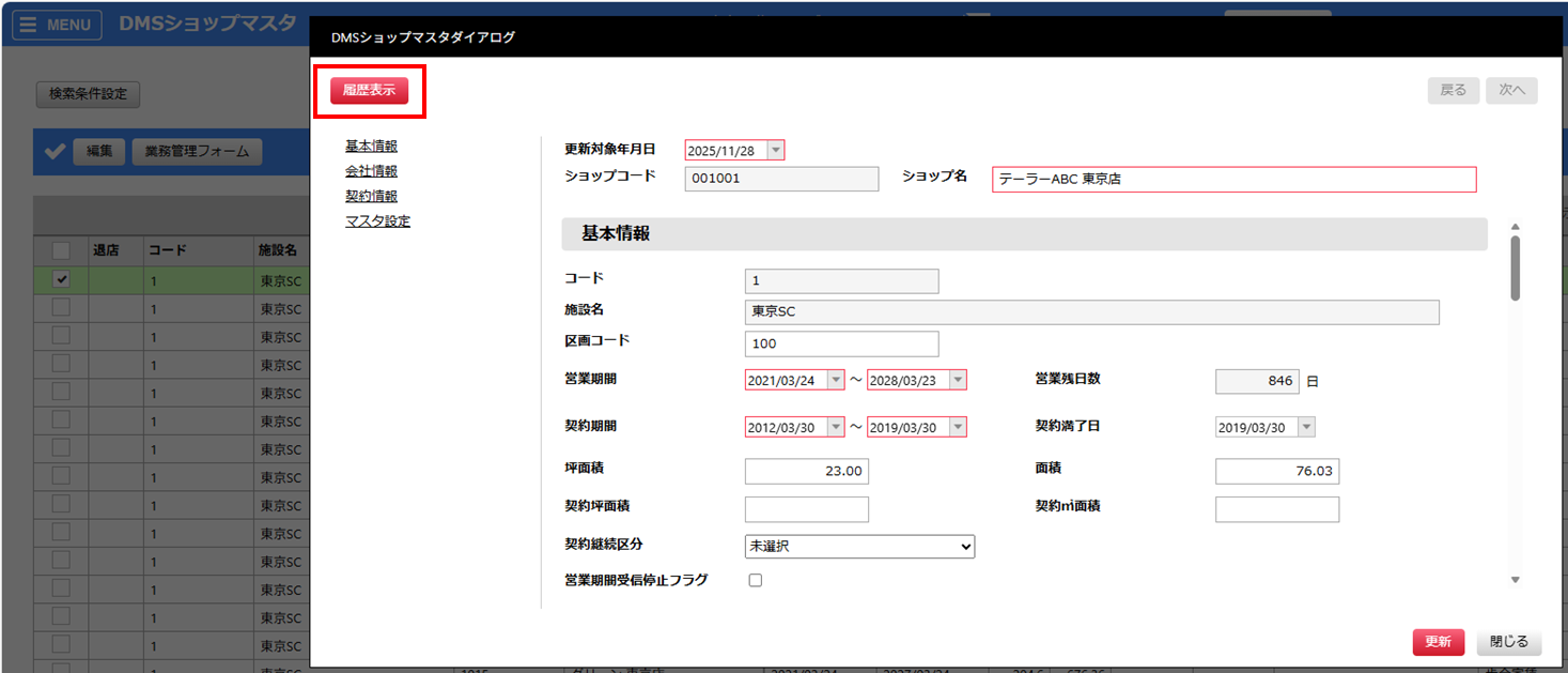 DMSショップマスタダイアログの[履歴表示]ボタンをクリックすると、
